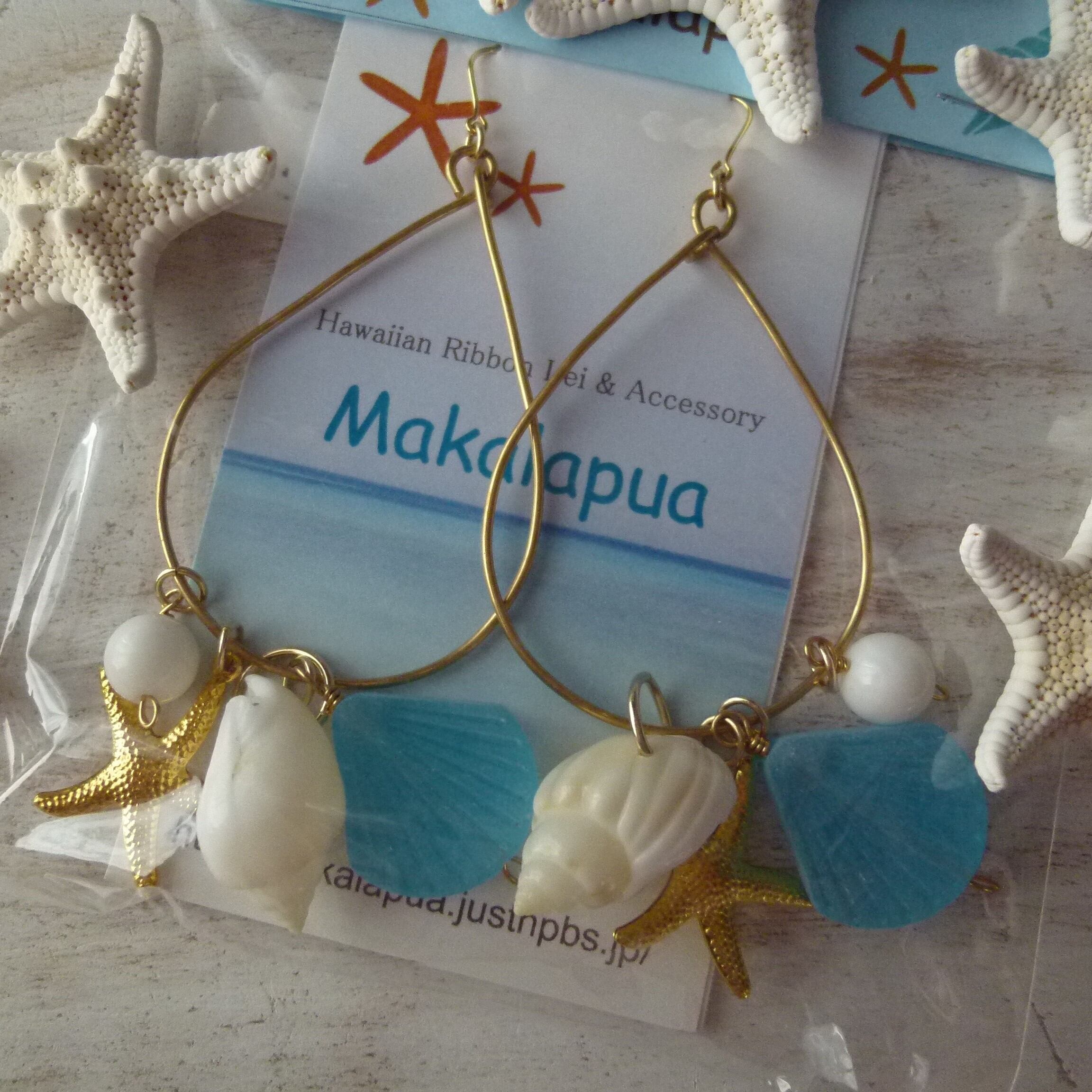 Gプラチャーム(ヒトデ)、シェル(巻き)、シーグラス(アクア・シェル)、ホワイトシェル(ラウンド)、ピアスフック、丸カン(ロジウムGメッキ)、アーティスティックワイヤー(Gカラー)