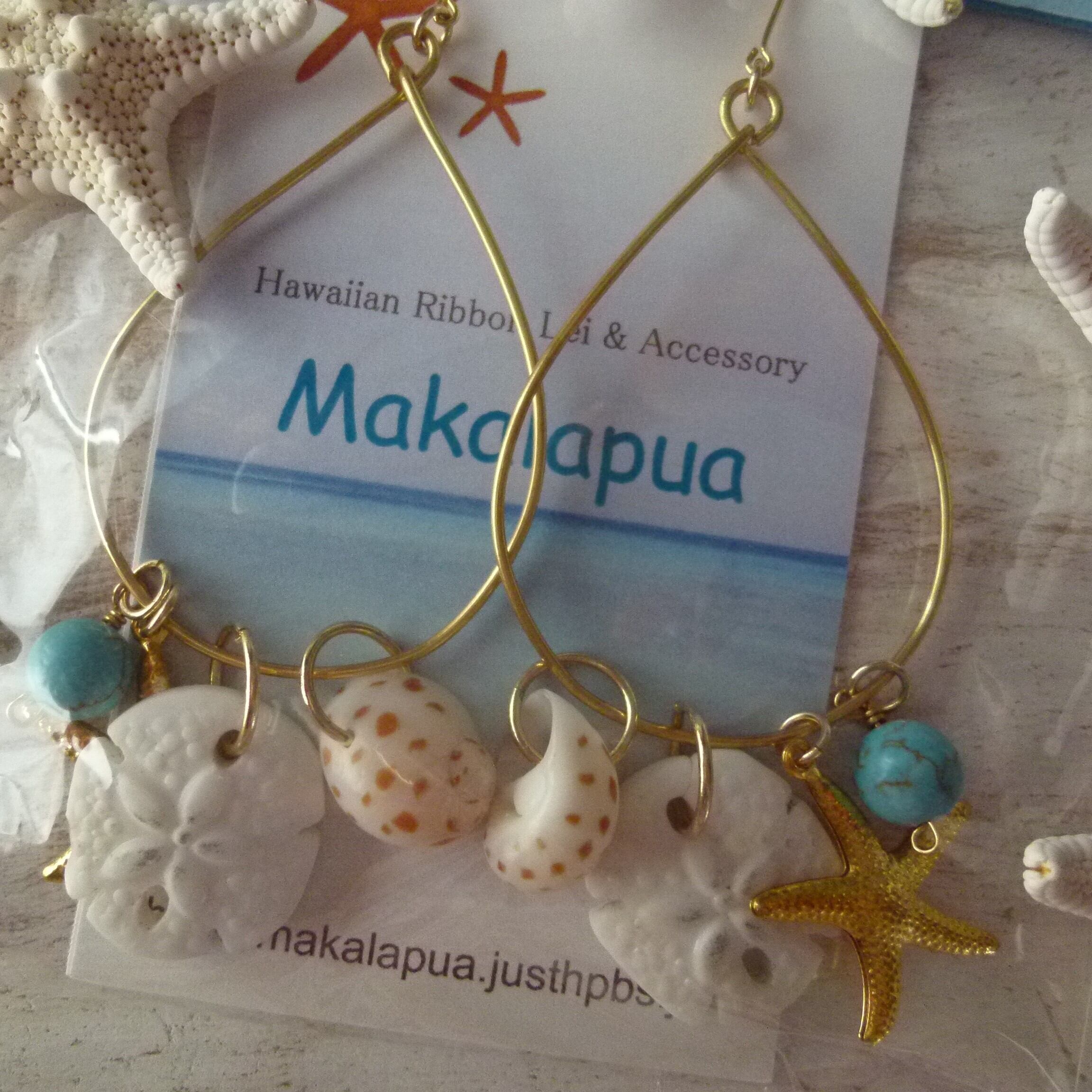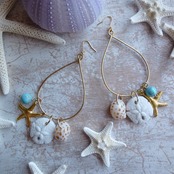 Gプラチャーム(ヒトデ)、シェル(巻き)、シーグラス(ホワイト・シーダラー)、マグネサイトターコイズ(ラウンド)、ピアスフック、丸カン(ロジウムGメッキ)、アーティスティックワイヤー(Gカラー)