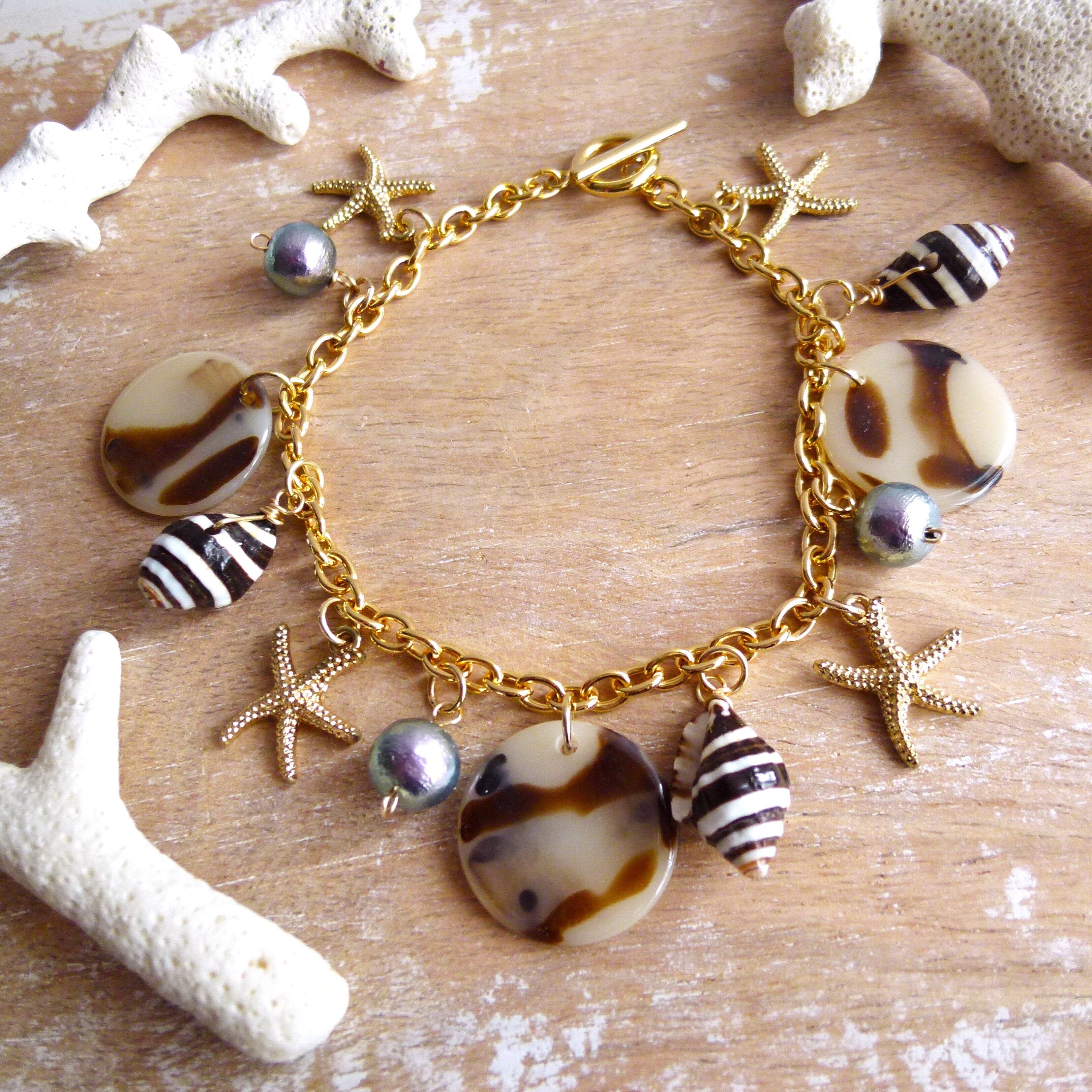 Gメタルチャーム(ヒトデ)、シェル(巻き)、べっ甲≪合成樹脂≫チャーム(コイン)、コットンパール(リッチグレー)、ブレスレットパーツ、丸カン(Gメッキ)、アーティスティックワイヤー(Gカラー)