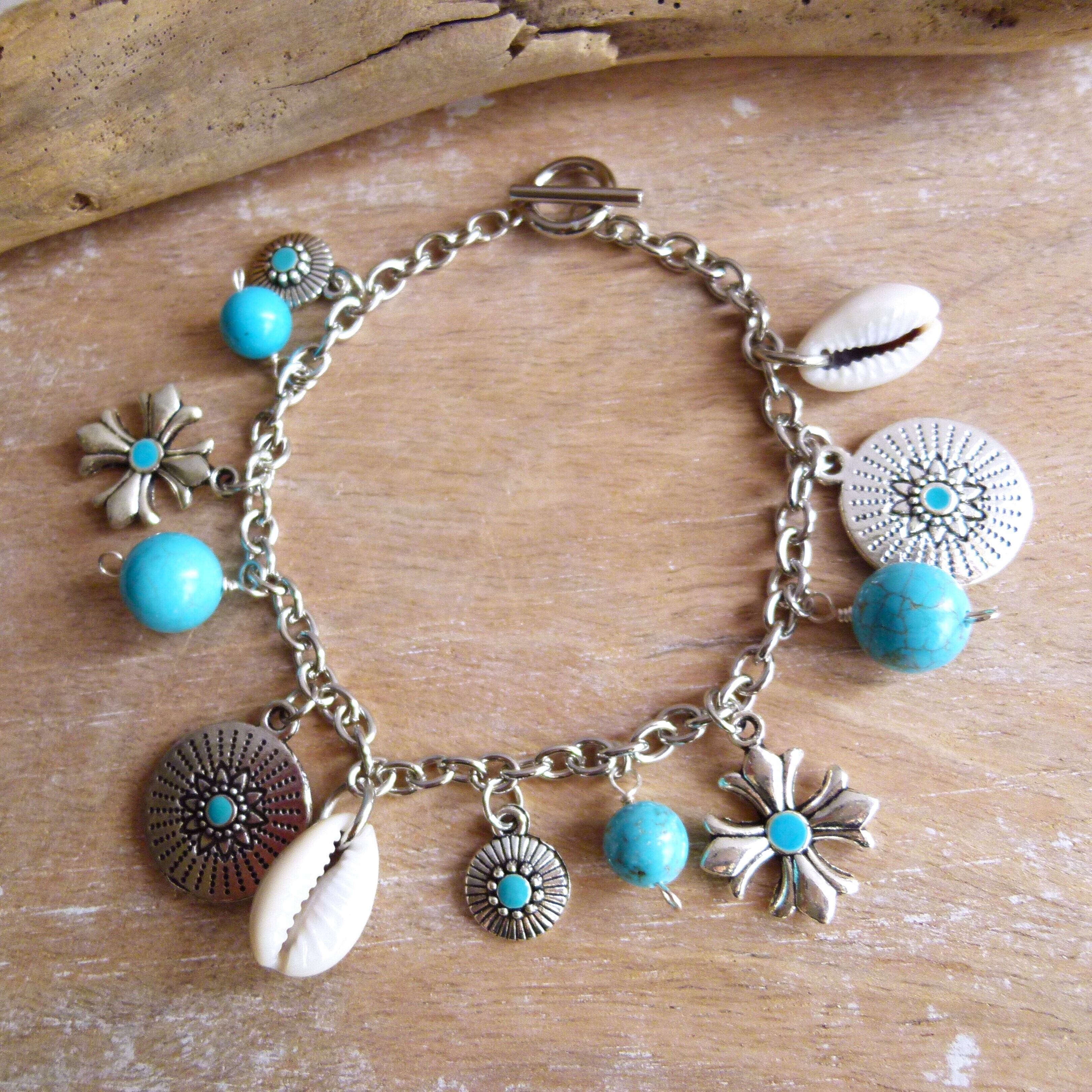 SLVタルチャーム(コンチョ風・クロス)、マグネサイトターコイズ(ラウンド)、シェル(タカラ貝)、マグネサイトターコイズ(ラウンド)、ブレスレットパーツ、丸カン(ロジウム)、アーティスティックワイヤー(SLVカラー)
