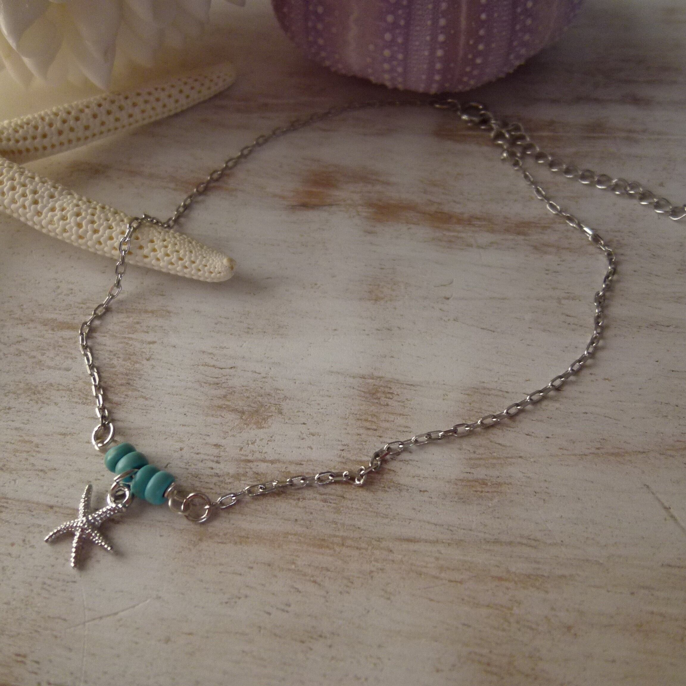 SLVタルチャーム(ヒトデ)、マグネサイトターコイズ(ボタン)、チェーン(24㎝)、丸カン(ロジウム)、引き輪、アジャスター(ロジウム)、アーティスティックワイヤー(SLVカラー)