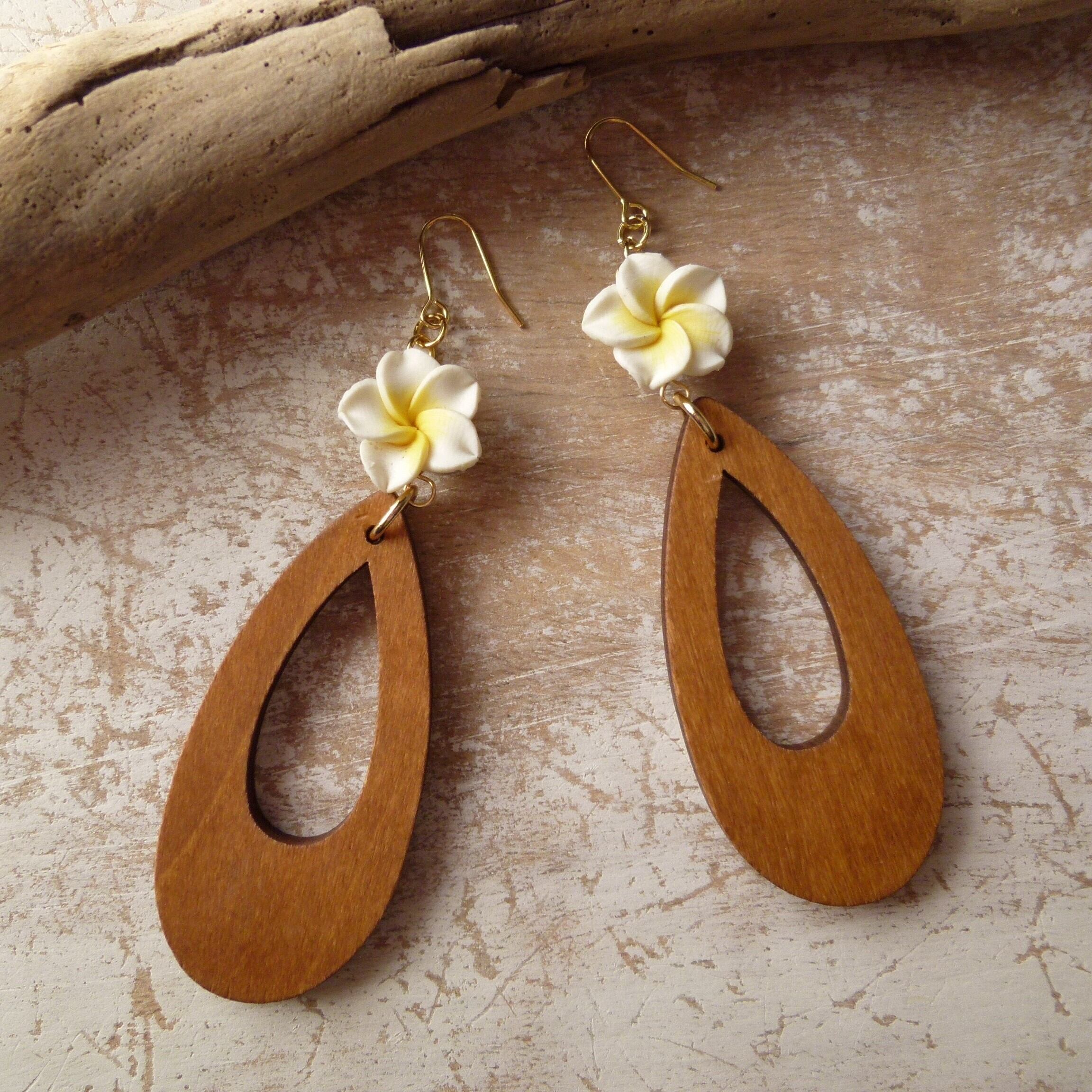 ウッドパーツ(ブラウン・ドロップ)、クレイチャーム(プルメリア)、ピアスフック(ステンレス)、丸カン(Gメッキ)、アーティスティックワイヤー(Gカラー)