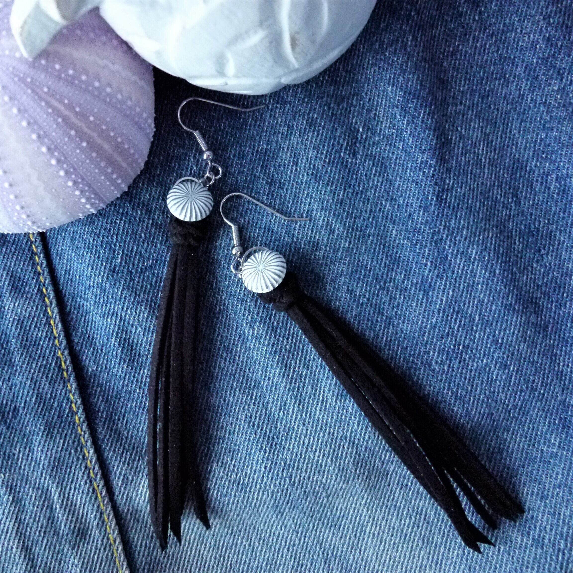 コンチョボタン(ニッケルホワイトカラー)、スエード調合成皮革(ブラック)、エスコード(蝋引き糸)、リングパーツ(ロジウム)、フックピアス、丸カン(ロジウム)